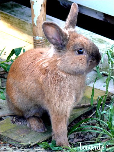Op 13 december 2008 zag ik een mij onbekend konijn op de Bongerd rondhuppelen, heel gemoedereerd knabbelend aan het herfstgroen. Met zoveel voedsel zal onze nieuwe parkbewoner best de winters door komen. bongerdje@deds.nl |
