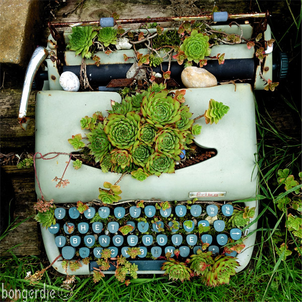 Een voor velen onbekend en oer-uitziend object in de tuin, met sedum plantjes
